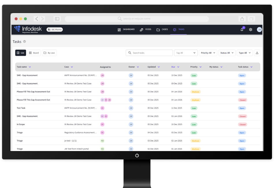 The Infodesk Regulatory Workflow Solution is a brand new, purpose-built solution that helps regulatory, GxP, quality, and pharmacovigilance teams turn regulatory updates into structured, auditable actions. It streamlines impact assessments, improves collaboration, and brings clarity to complex workflows. See it in action at table 4.